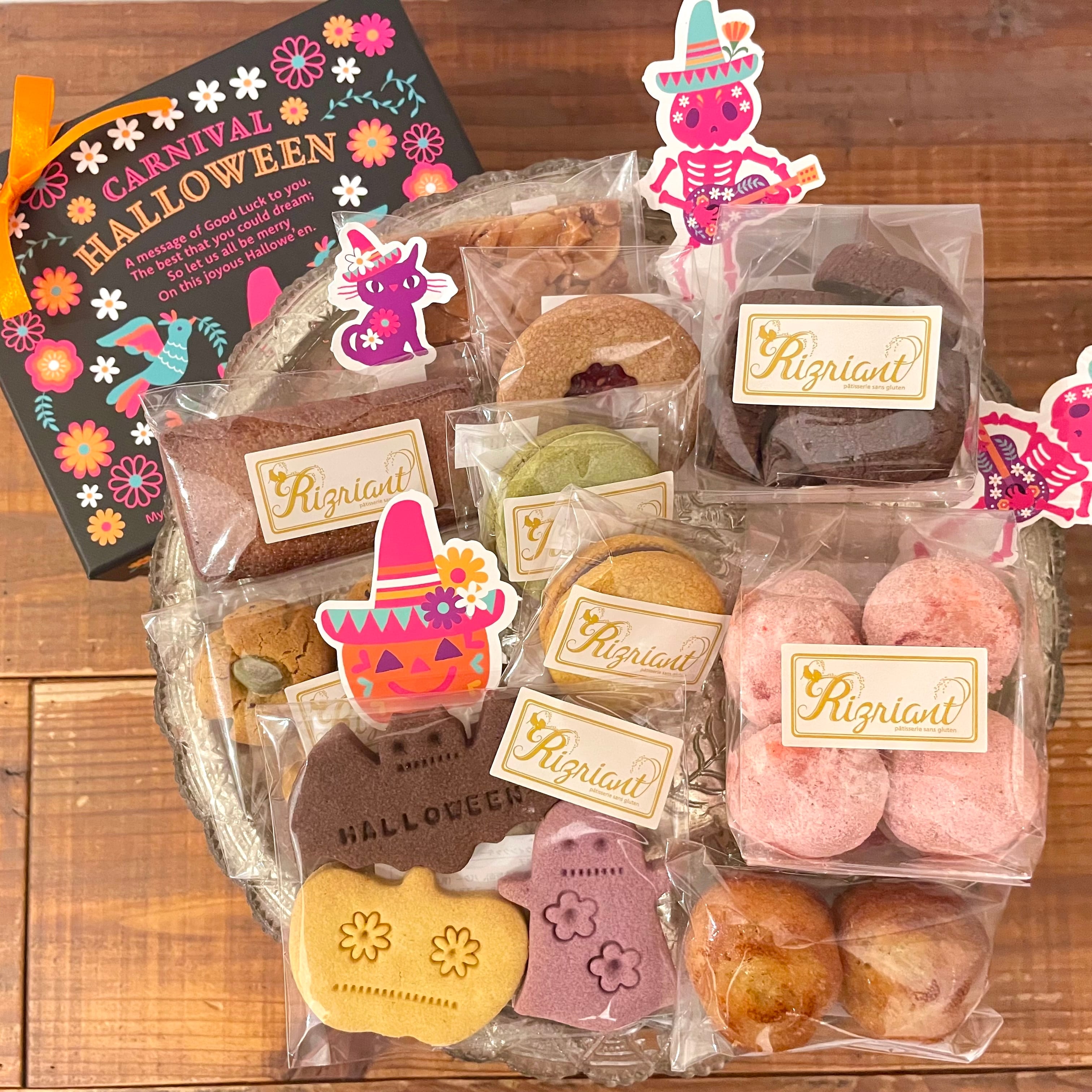 かぼちゃ、紫芋、ココアのハロウィンクッキーと一緒にリリアンの人気のお菓子をメキシコ風のカラフルで可愛いボックスに詰め合わせました。